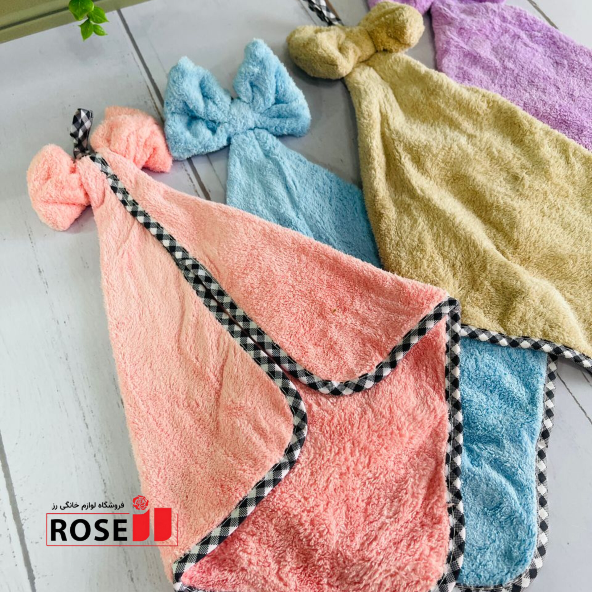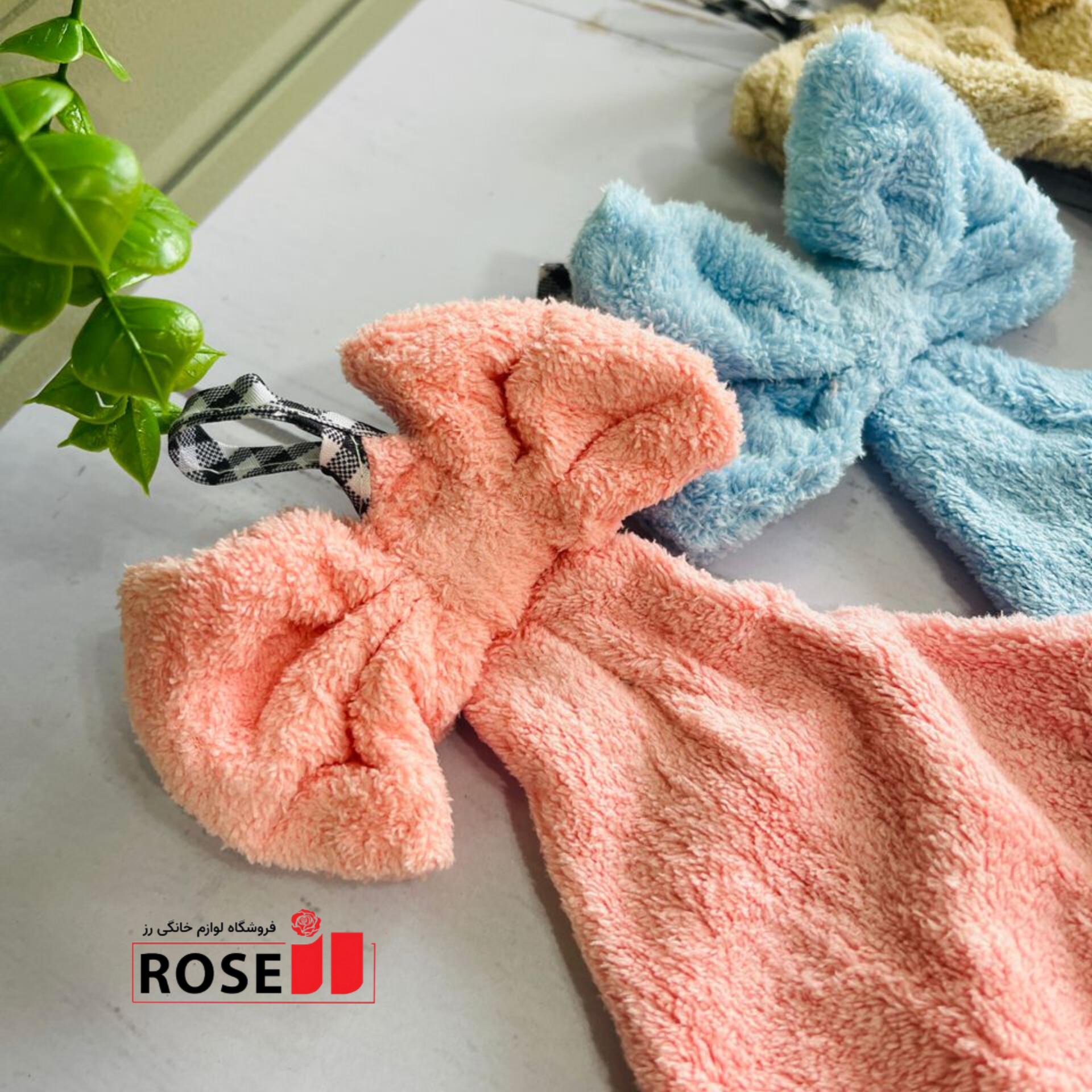 دستمال آشپزخونه آویز دار پاپیونی ضد خط و خش نرم ولطیف با آبگیری عالی رنگ بنفش، کرم، آبی، صورتی موجوده